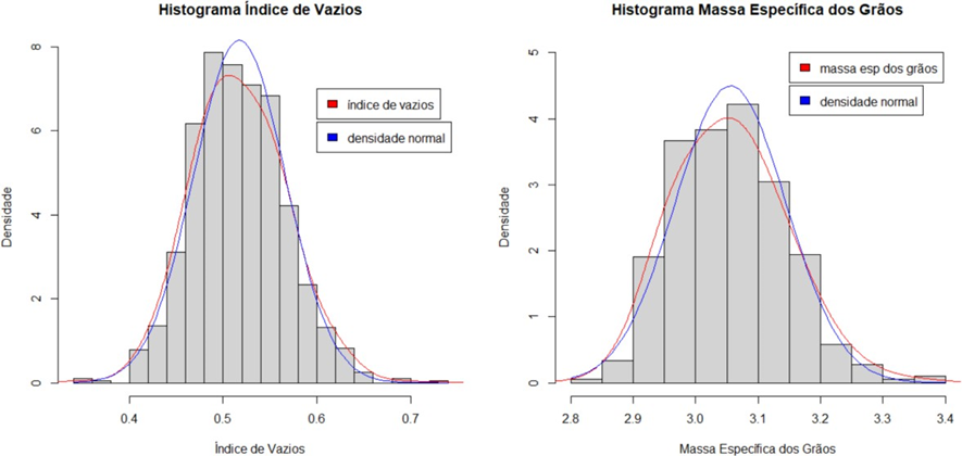 Como ya se ha dicho, la base de datos se compone de datos reales referentes a la colocación de una pila de desechos. Se analizaron 1030 muestras, sin que faltaran datos, y 8 de los puntos analizados están por encima de la especificación técnica del proyecto. Dado que el parámetro de liberación para las capas en cuestión es el índice de vacíos, también se analizarán los parámetros geotécnicos Masa Específica de Granos (rs) y Masa Específica Aparente in situ (rd), ya que el índice de vacíos se obtiene analíticamente a partir de la relación de éstas, según la Ecuación 1.