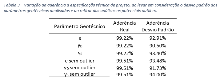 Se calculará un nuevo valor de la relación de vacíos, así como el nuevo cumplimiento de la especificación técnica de diseño, considerando tres situaciones diferentes: considerando la desviación típica de la masa específica de los granos; de la masa específica seca aparente in situ; y de la relación de vacíos. Posteriormente, se realizarán los mismos análisis sin tener en cuenta los posibles valores atípicos identificados en la figura 2. Sólo se considerarán los casos más críticos en términos de su efecto sobre el resultado de la proporción de huecos, es decir, la desviación estándar de su variable respectiva se añadirá a γS, se restará de γD y se añadirá a la proporción de vacíos. Los resultados obtenidos se muestran en la Tabla 3.